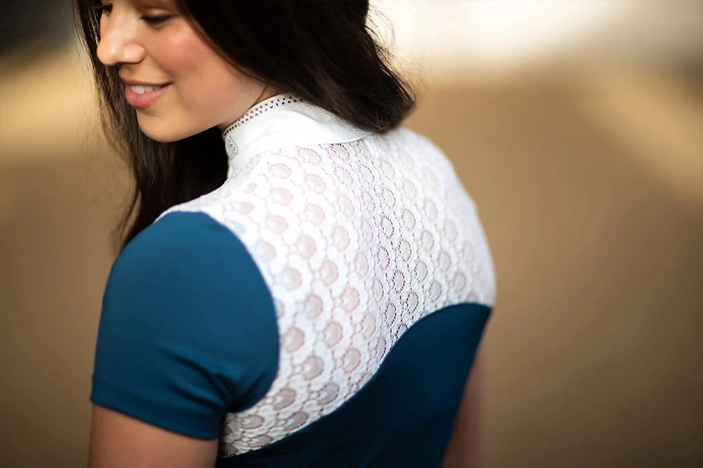 Crystal Champion Top is designed in a beautiful blue colour with gorgeous white lace details at top front and back. Decorated with beautiful crystals along the collar edge and crystal buttons at the front which will make you stand out from the crowd when competing. Wear it with our competition jacket from the Blue Meadow collection for a complete look.