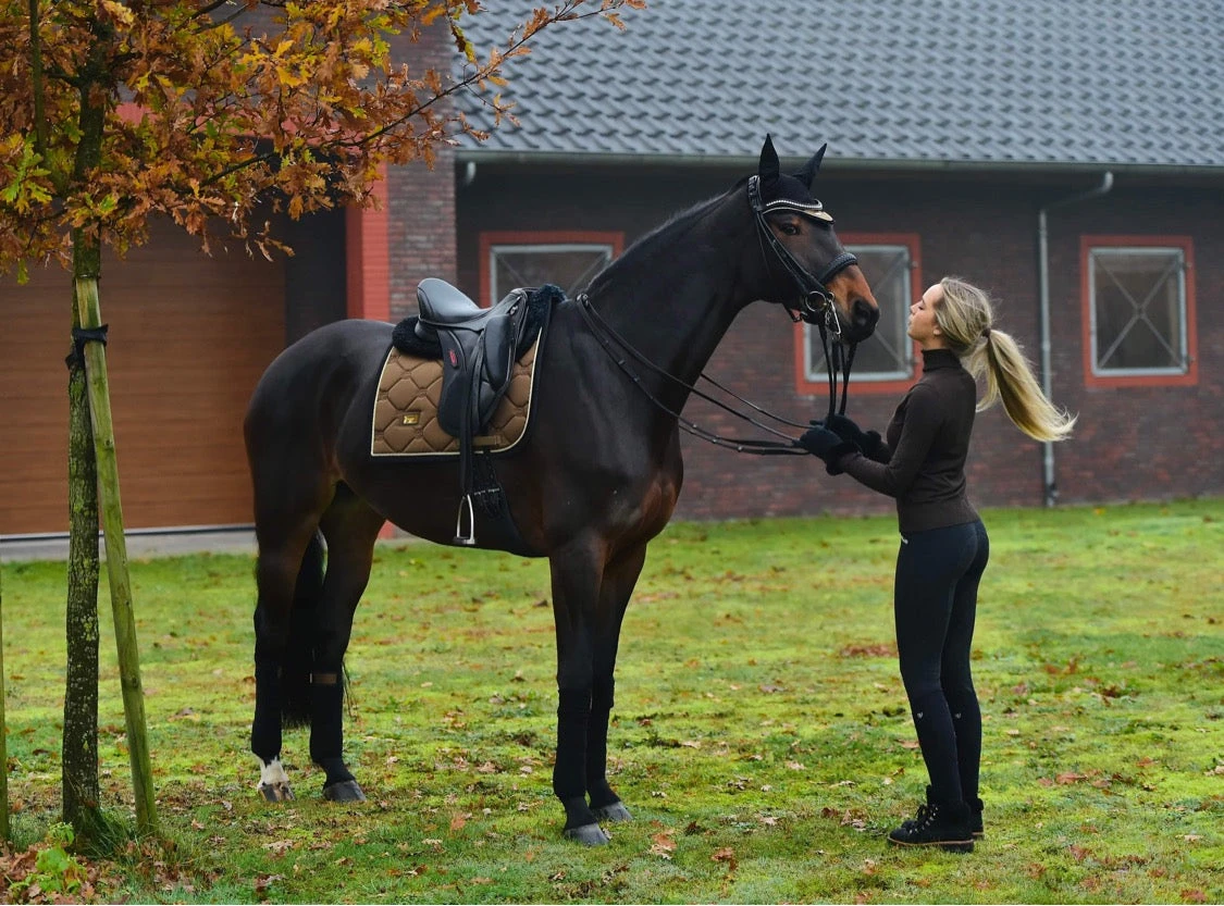 Exclusive dressage saddle pad in shiny Golden Brass with beautiful golden details. The saddle pad is crafted in a shiny, dirt repellant material with quick dry on the inside that keeps your horse dry throughout sweaty sessions. Anatomically shaped to fit your horse perfectly. Quilted with Equestrian Stockholm’s stylish pattern.
