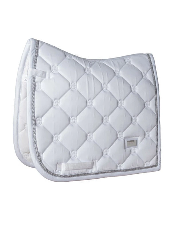 Nice dressage saddle pad in white with silver details and pattern in Equestrian Stockholm’s logo.