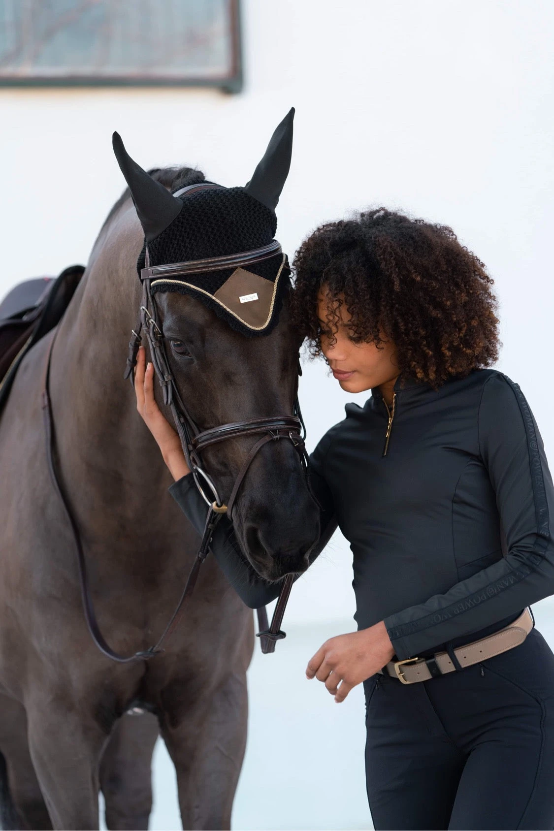 The coolest color combination of the season is here! Luxurious ear net designed in black with gold and ‘Golden Brass’ details. It protects your horse from both insects and noise. Crocheted ear net with elastic cloth by the ears to prevent gall. Style with other pieces from the same collection for a complete look.
