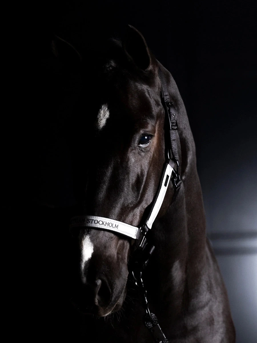 Keep it trendy with this exclusive black halter with reflective details. Styled with matte black buckles and combined with black neoprene padding. Embellished Equestrian Stockholm logo on the noseband. Style with other pieces from the Luminous Black collection for a complete look.