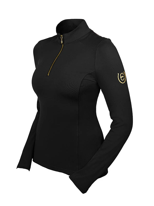 Exclusive and sporty Vision top in a luxurious black colour with gold details. The top is crafted in a breathable, recycled polyester blend with a slim fit, mesh along the sides and on the sleeve under arm. Decorated with a vertical Equestrian Stockholm logo on the back and a smaller logo on the left arm. Wear it with other products from the Black Gold collection for a complete look.