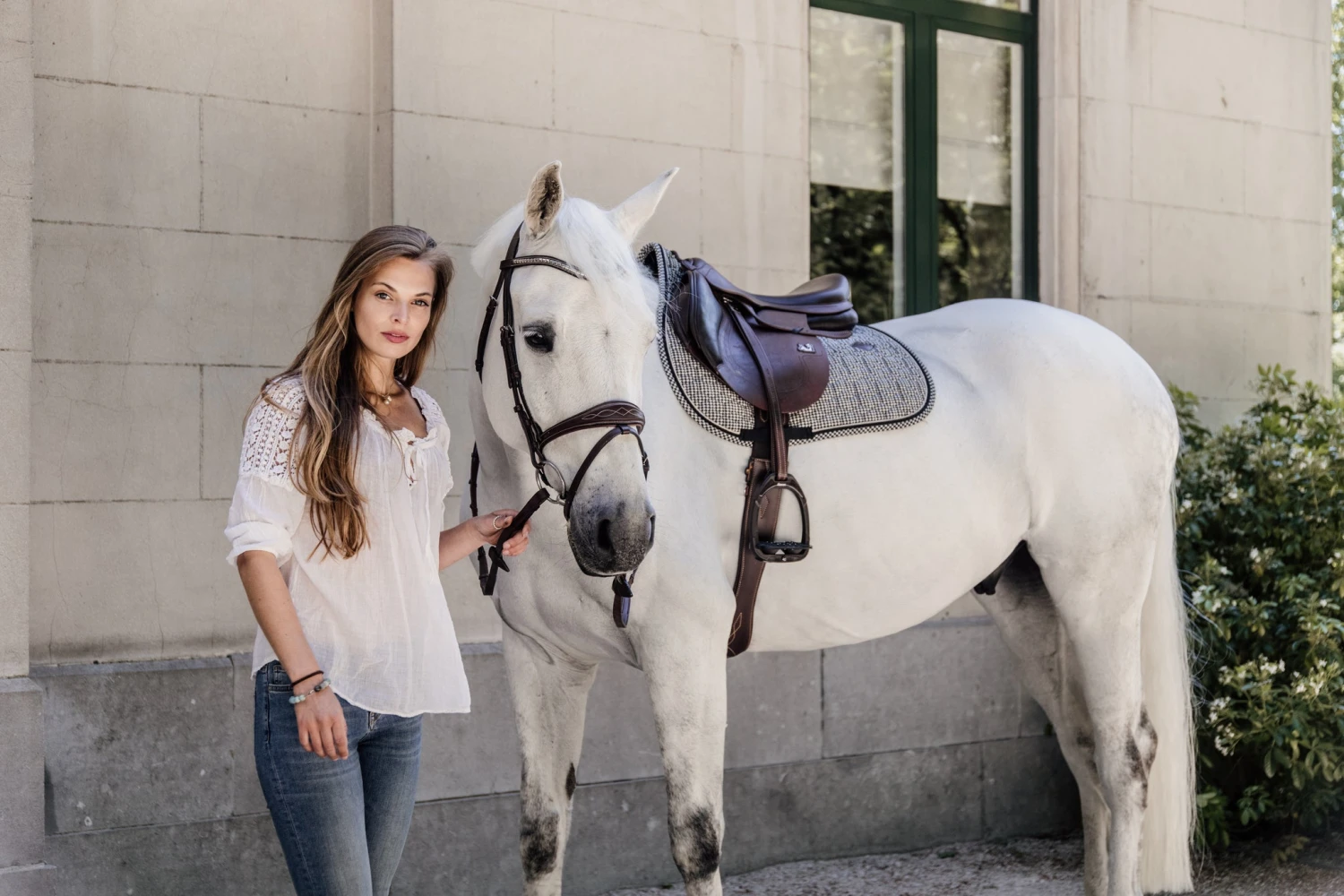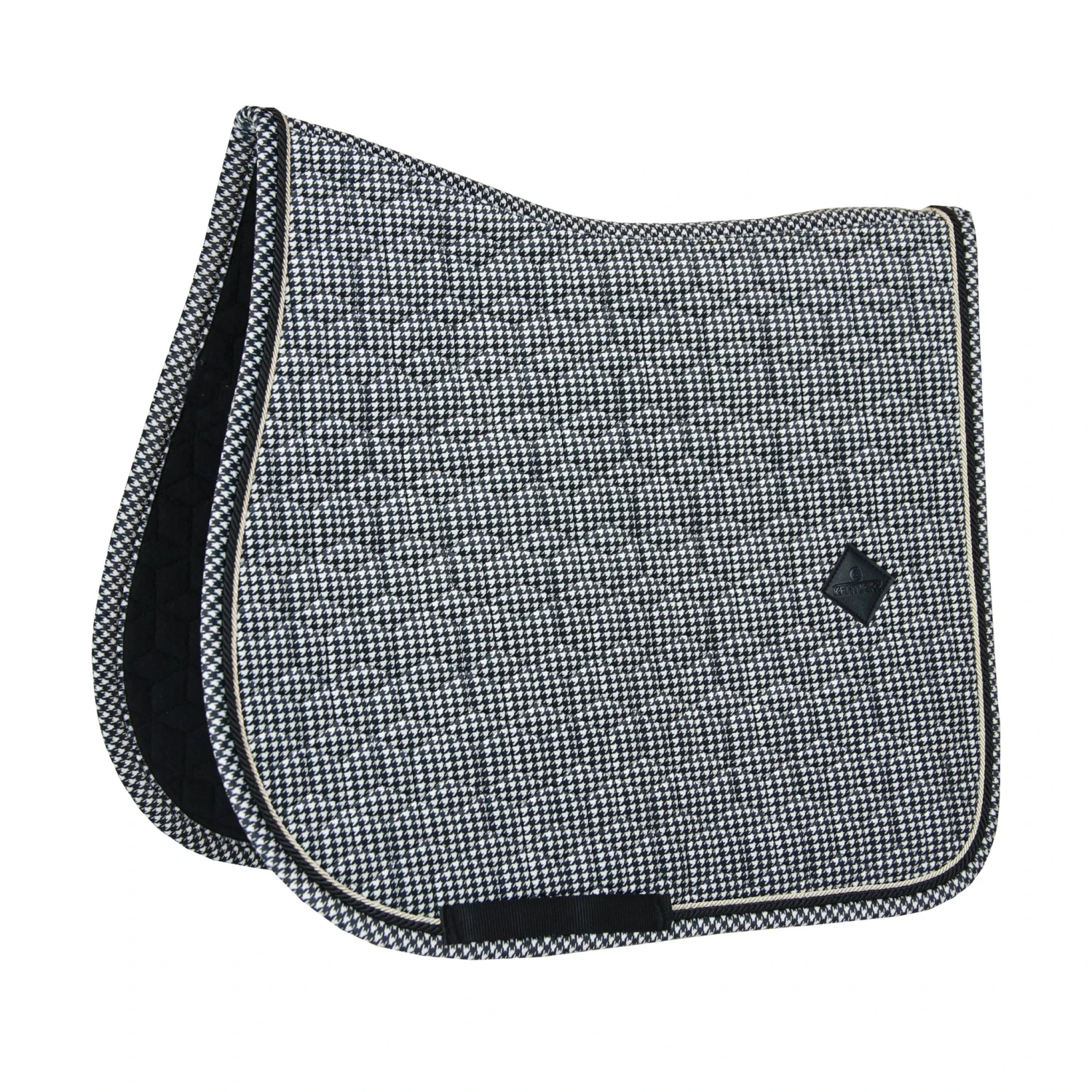 This saddle pad is printed with the Pied-de-Poule pattern, a fashion classic that brings rhythm and elegance, on a microfiber fabric. This saddle pad has a quilted star patten and a double twist piping in similar tones.