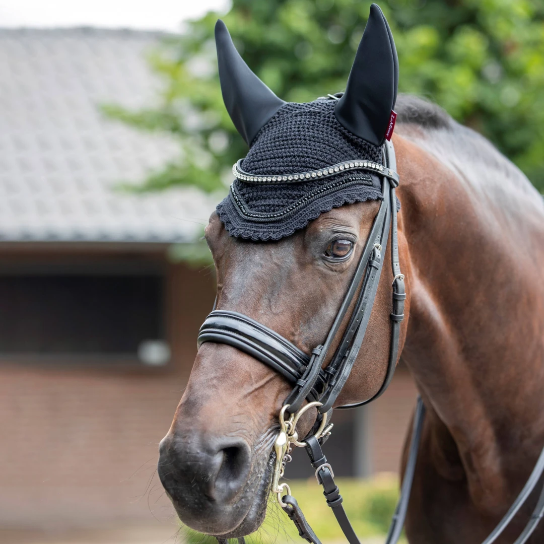 The newly designed Acoustic Diamante Fly Hood maintains all the fantastic qualities from our Acoustic range, with an improved fit to accomodate the more anatomical style bridle head pieces. The deeper section behind the ears gives a secure fit with the ergonomical, low profile shape around the ears providing ultimate comfort